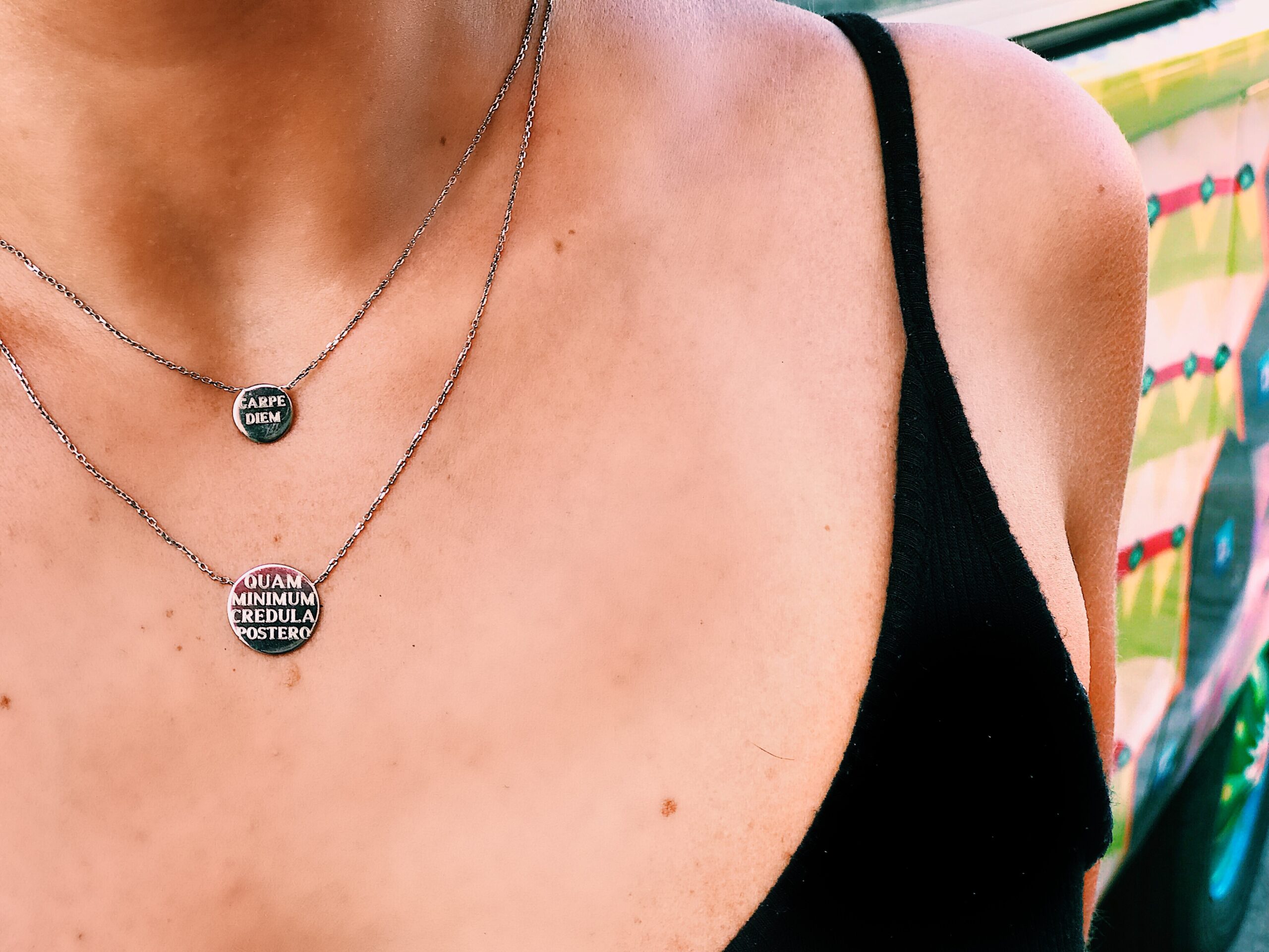 Partie de ce constat, je me suis fait graver récemment un collier personnalisé sur une double chaine à médaille. Comme je l’ai déjà dit dans plusieurs articles, je n’aime pas les messages « tout fait », vus et revus ou régressifs : « mademoiselle » « madame », « love », « Connasse », « I’m a unicorn »… Choisir de se faire graver un message sur un bijou personnalisé, c’est à mes yeux, exactement comme choisir ce que l’on va se faire tatouer sur la peau. J’assimile beaucoup le bijou au tatoo car je crois que l’un comme l’autre doit avoir une signification qui nous est propre, qui nous ressemble, qui résonne en nous.